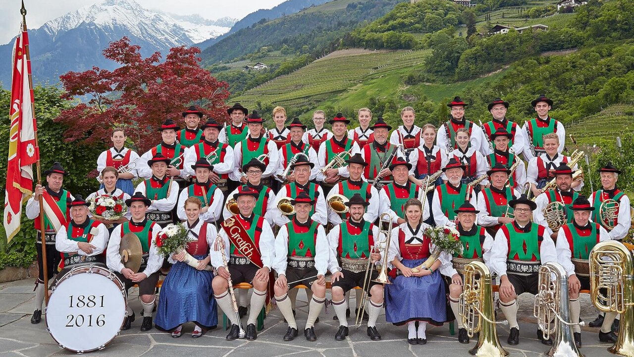 Heute genießen wir Klänge der Musikgruppe "Laaser Böhmische", mit Blick zum hohen Kirchturm der Pfarrkirche, zum historischen Rathaus und zum Schloss Schlandersberg, das hoch am Felsen thront.