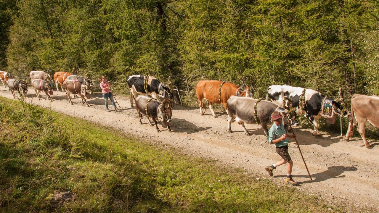 Am 14. September kehren die festlich geschmückten Kühe von ihrer Sommerfrische auf der Stafler Alm ins Tal zurück.