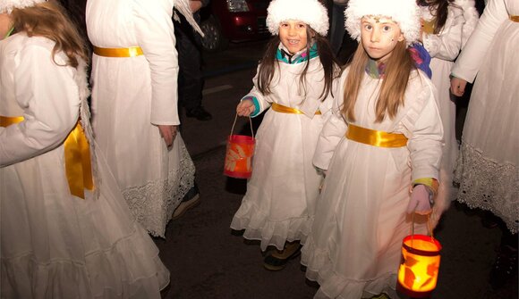 Dann beginnt der Engelsumzug, der das Zentrum mit Fackeln und Kerzen erleuchtet. Große und kleine Engel, Musikgruppen und Pferdekutschen bilden einen zauberhaften Umzug.