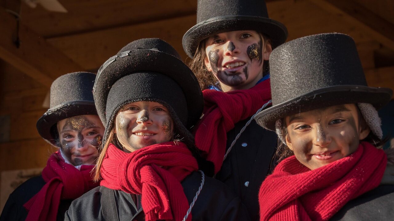 Kinder in Schornsteinfeger-Kostümen verteilen Glücksbringer gegen eine Spende.