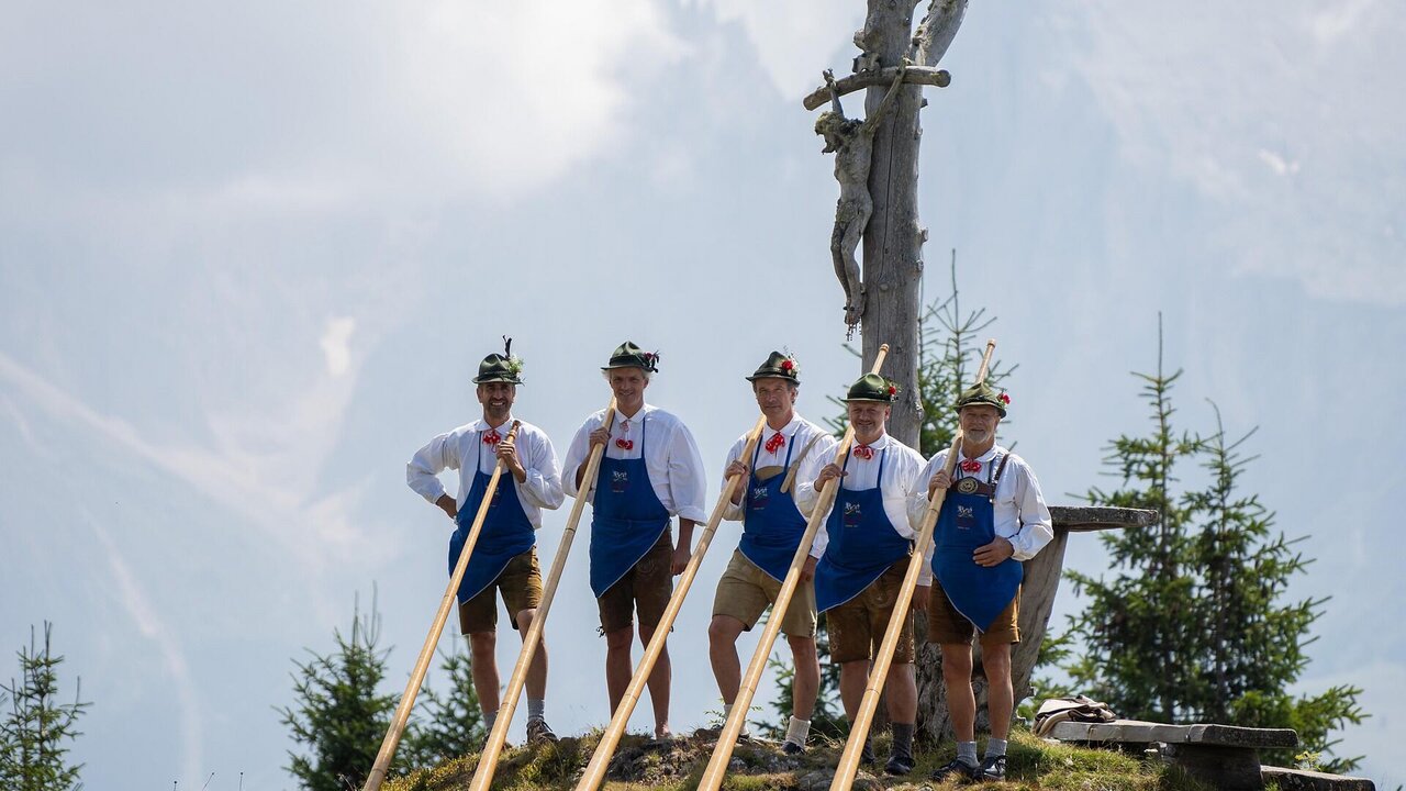 Internationales Alphornbläsertreffen mit Gruppen aus verschiedenen Ländern.