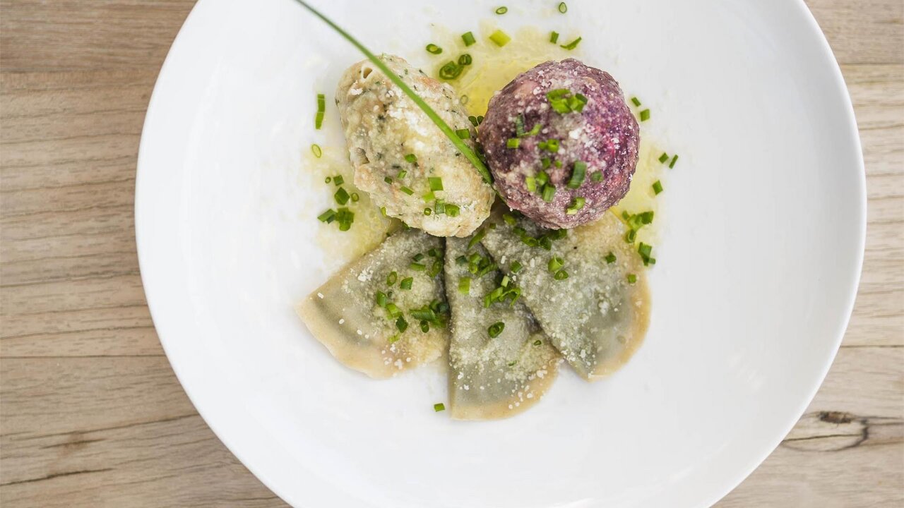 Abendmenü: Knödel Tris bestehend aus Käse-, Bärlauch- und Buchweizenknödel mit Krautsalat, Buttermilchcreme und Früchte der Saison.