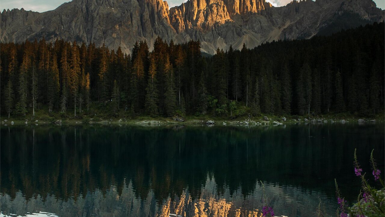 ....Auf der Seebühne des Karer Sees, mit einzigartigem Blick über das türkis-blau-grüne Wasser und auf den Latemar.