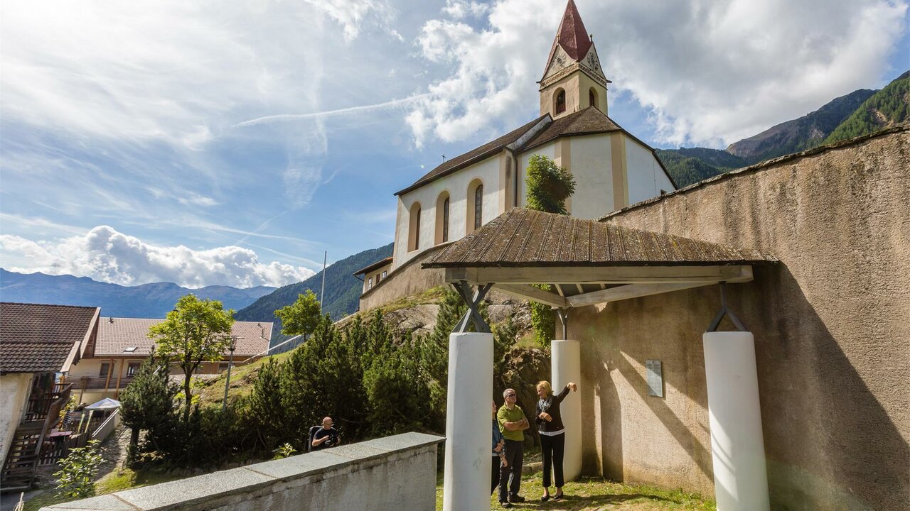 Richard erzählt Ihnen interessantes über die Geschichte des Schnalstales, führt Sie durch die Pfarrkirche zur hl. Katharina und über den symbolträchtigen Friedhof. An jenem Kraft verströmenden Platz stand einst die Schnalsburg, jener alte Burgturm dient heute noch als Glockenturm.