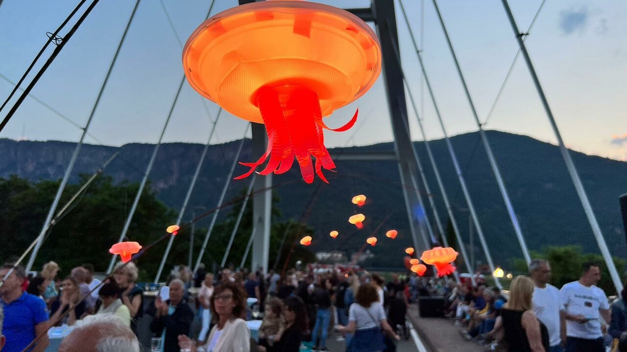 Die Pfattner Brücke verbindet im Alltag, doch an diesem Abend wird sie selbst zum Schauplatz. Für das Light+Food+Music Festival wird die Straße gesperrt und die moderne und avantgardistische Konstruktion verwandelt sich in eine Bühne. Die Brücke wird mit Lichtinstallationen in Szene gesetzt, die das Wasser der Etsch spiegeln und das Bauwerk in sanfte Farbtöne tauchen. Musikerinnen und Musiker untermalen die Illuminationen, sodass die Brücke zu einem Gesamtkunstwerk aus Licht, Klang und Bewegung wird.