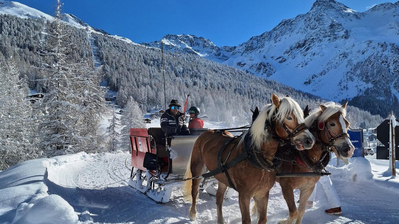 Die klare Winterluft, der Blick auf die umliegenden Gipfel und das gleichmäßige Schnauben der Pferde machen diese Fahrt zu einem unvergesslichen Naturerlebnis – für Groß und Klein.