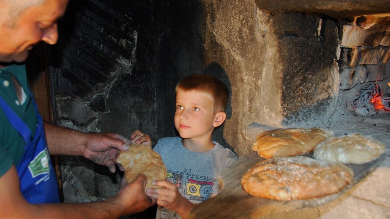 Baking together traditional bread in a wood-burning oven is fun and not difficult. The farmers demonstrate step by step how to mix all ingredients to form a dough.