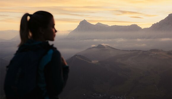The Dolomites at sunset, when the sunlight paints the mountains in vibrant colours. We call it enrosadira, which means that the mountain peaks turn shades of pink, orange, cobalt, violet, and indigo.