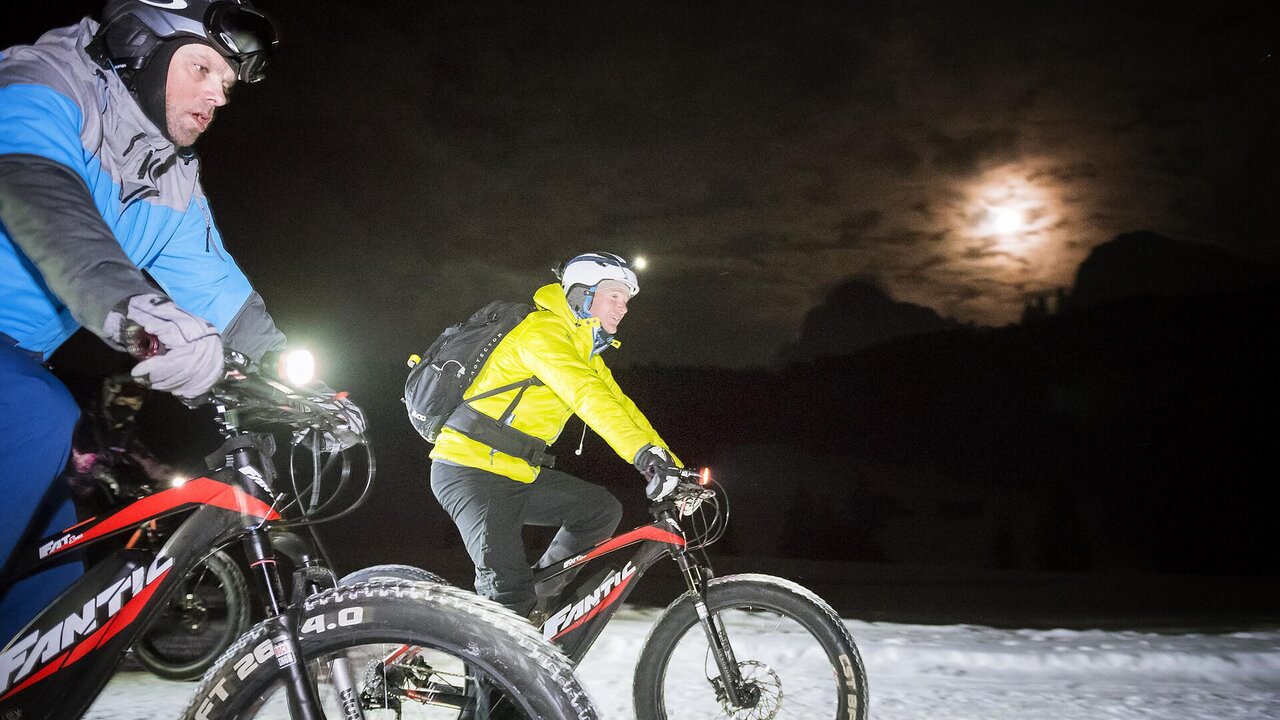 Cycling even in winter! Following groomed paths, you can explore Monte Pana and Alpe di Siusi in the evening accompanied by the certified bike guide Wolly. The adventure ends with a delicious meal in a traditional mountain hut on Alpe di Siusi: try this unique snow experience on thick wheels.
