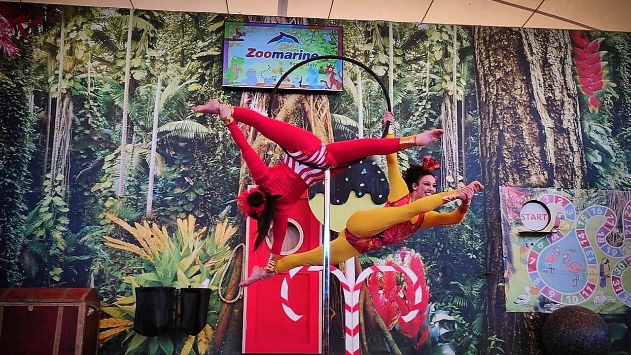 Aerial acrobatics on hoop and silks, juggling, life hoop dances, contortionism, fire magic, balancing acts on rolla-bolla and unicycle, knife-throwing at a human target, a dancer inside a crystal ball, clown performances, comedy sketches, audience entertainment, and much more!