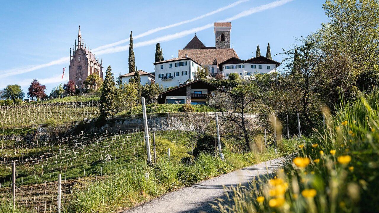 Over the Leiterweg, the hike continues to the Innerleiterhof vinery, where winemaker Karl gives a short vineyard tour – including a tasting of a fine wine. Along the Maiser Waalweg path, we make a stop at the Rast am Waal for a traditional "Speckbrettl" and a glass of wine.
