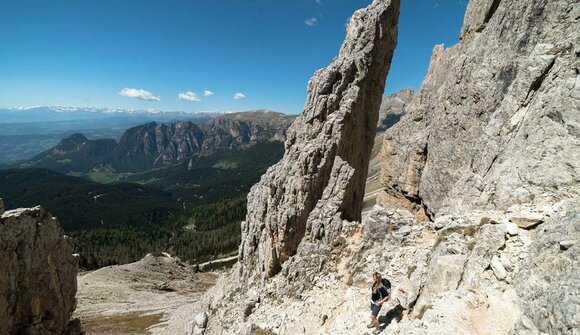 After taking the Tiers cable car to the Frommer Alm mountain hut and the König Laurin 1+2 cable cars to the Kölner mountain hut, our hike begins. We cross the Tschagerjoch and descend to a crossroads that leads to the Cigolade Pass. The strenuous ascent is rewarded with a spectacular view of the Fassa Valley. We then descend to the Rotwand hut, where we take our lunch break. We then follow the high trail past the Christomannos monument to the Paolina hut. From here we take the lifts and the bus back to our starting point in St. Cyprian.