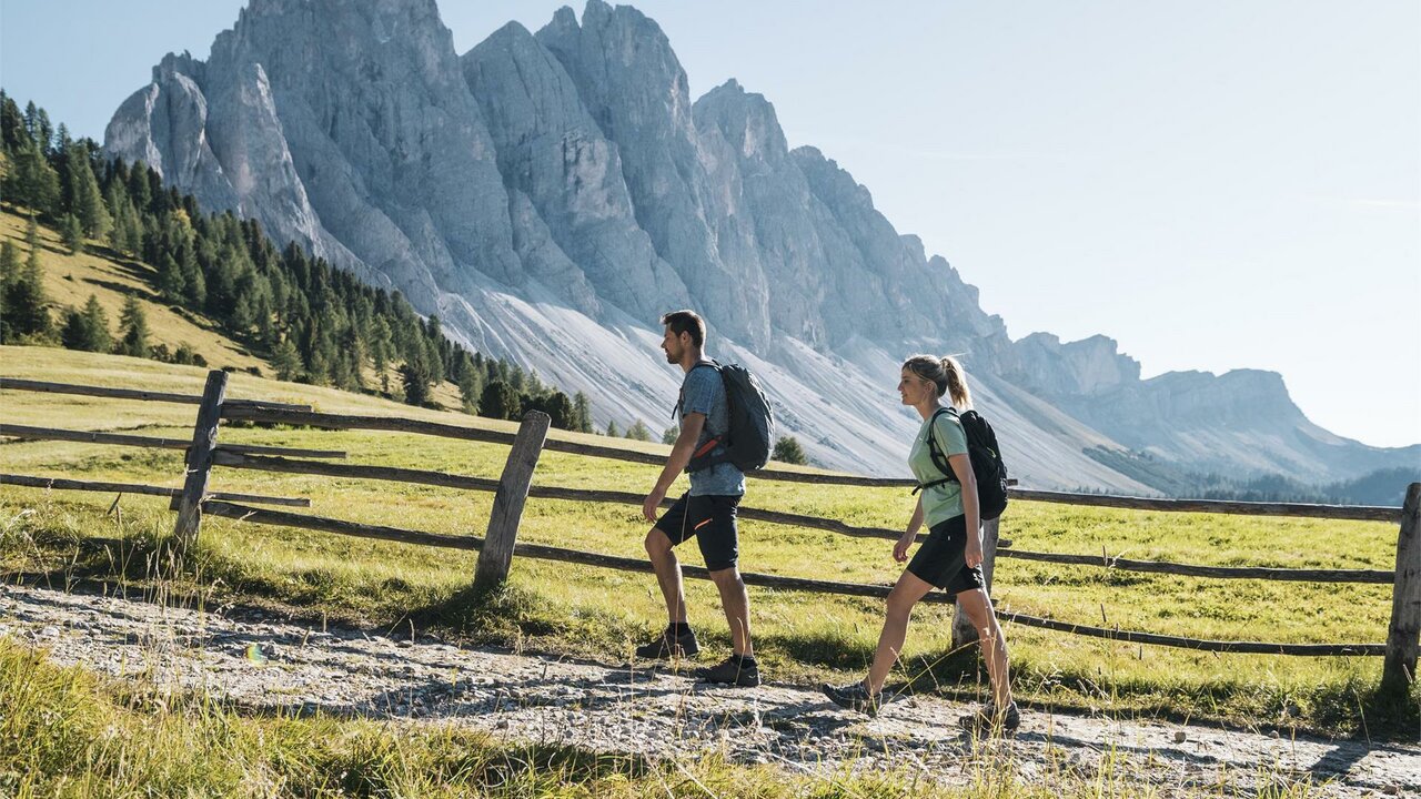 From Ortisei we take the funicular to Rasciesa, from there we hike across the alpine pastures and the Adolf Munkel path at the foot of the Geißlerspitzen to the Gschnagenhartalm and on to Zans in the Villnöss Valley.