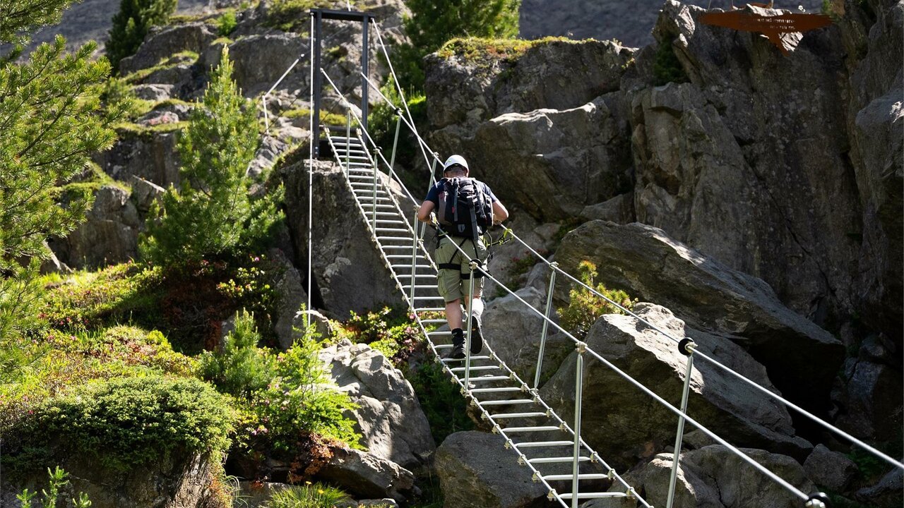 The Larix Via Ferrata is an action-packed family-friendly via ferrata at the end of the Schnalstal Valley. This unique via ferrata with its many rope bridges, two sky ladders and a Tyrolienne (a type of zip line) leads along a waterfall from Kurzras up towards the Teufelsegg Hütte mountain hut, which offers refreshments. The "Alpin Trail" adventure hiking path runs parallel to it. These two routes intersect several times, allowing for an exit at any point. Families can therefore start together, some taking the action-packed via ferrata and others the challenging "Alpin Trail" hiking path.