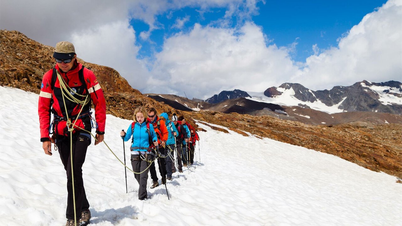 The Ötzi Glacier Tour is an extremely varied one day round tour, which crosses the main chain oft the Alps. It takes place every Tuesday and upon request. The undisputed highlight of this accompanied glacier trekking tour is the discovery site of Ötzi the Iceman (3,210 m).