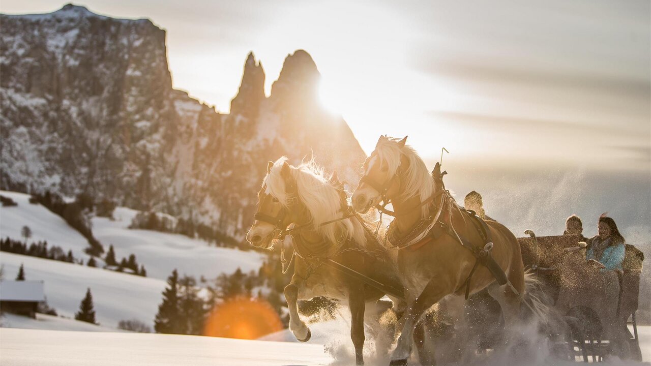 Wrapped up in soft blankets our horse drawn sleigh will comfortably take you on a romantic journey across the snowy landscape of the Alpe di Siusi right up to the Gostner Alpine Hut, where you'll spend a very memorable evening. Candles lead the way to the hut, where an open fire and a flower prosecco will welcome you, followed by an exquisite meal served to your table as you enjoy the warmth of cosy lambskin and the candlelit ambience. And to round off the evening, the flicker of flaming torchlight will guide your way back home.