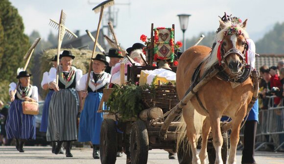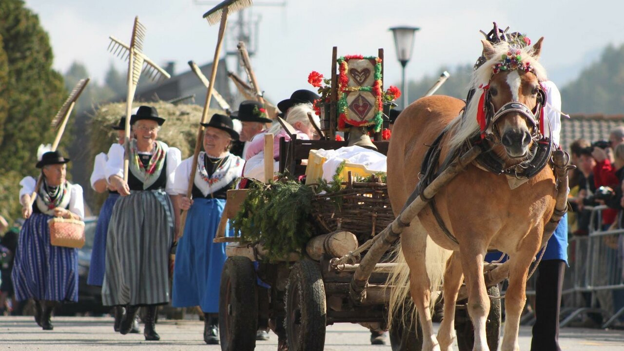 The transhumance accompanied by a celebration takes place on the Saturday just before the feast of the harvest. This year the event takes place on 4th October 2025. Accompanied by bells and wreaths the animals inhabit the area of Compaccio at 10am. The colourful herd consisting of 250 animals, some carts and some classic-style tractors will leave the Alpe di Siusi at this very time.
