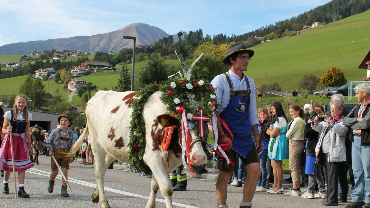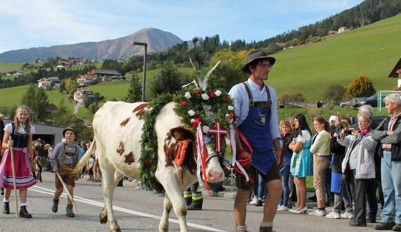 Experience the “Almabtrieb” in Terento! The ceremonial driving of cattle and sheep from the green pastures back to their home farms and warm barns is a long-standing tradition in Terento. For over 100 cows, calves and sheep this event marks the end of their stay in altitude where they enjoyed the fresh mountain air, tasty grass and cool nights. The animals are adorned with bells, wreaths, fresh flowers and ornate whetstone holders and they are driven down the valley by their herders. Plünderfuhren (procession floats), Goaslkrocha (whip crackers), Schuhplattlern (folk dancers) und and musical entertainment.