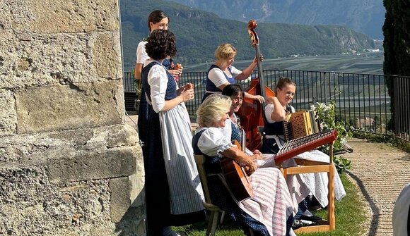 The men's choir from Ega and the "Traminer Gitschn" sing on the terrace of the Hotel Moar am Latemar and provide a colorful, musical evening.