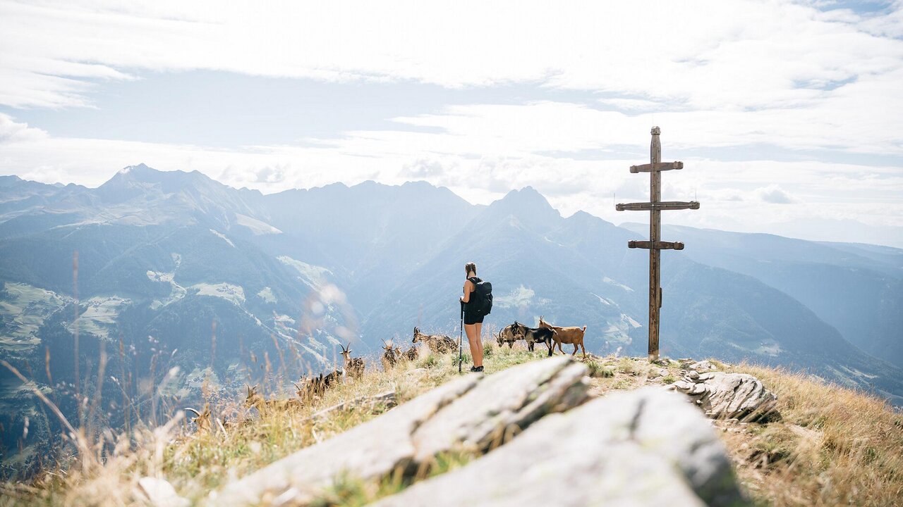 Approach to Stulles. The ascent follows trail no. 14 to the mountain meadows above Stuls (Stuller Mahder), continuing to the Hochalm hut and then along trail no. 26 to the summit. The final meters to the top are secured with a fixed rope to facilitate the ascent. The descent follows a circular route past the Stuller Mut and back to the parking area.