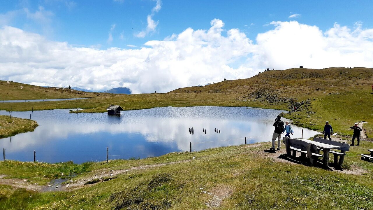 A short drive takes us to the tranquil Ladin mountain village of Welschellen/Rina. Free parking at the sports field/starting point (1,512m). First we hike gently uphill, with surprising views of the Dolomites, to the enticing Welschellener Alm/rest stop (1,947m). We soon reach the tree line, behind which wide, gentle mountain meadows stretch out. We cross a ridge to reach the Col da Lech summit cross (2,175m), which can be seen from afar. The hike continues gently up and down to the nearby, enchanting Glittner lakes. The way back (skipping the Col da Lech) is partly on the outward route.