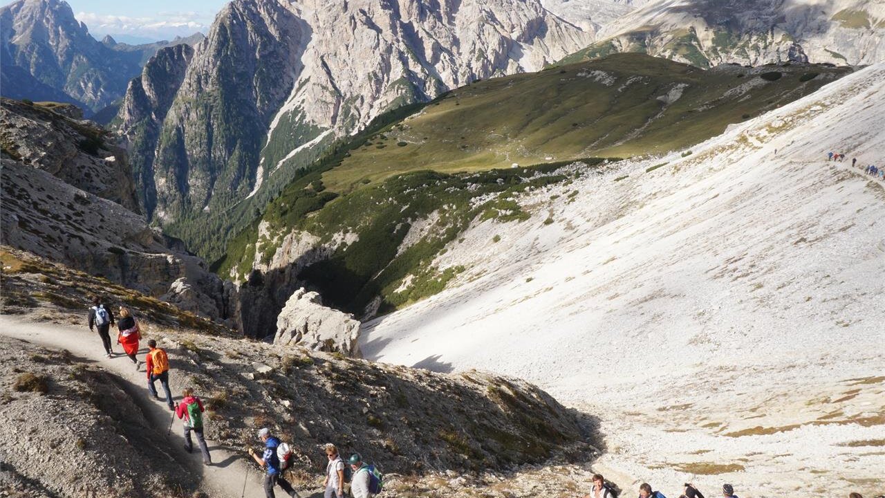 Hike around the Three Peaks – the most striking mountains of the Dolomites. The tour starts at the mountain hut Auronzo. Then you’ll hike towards the mountain hut Lavaredo to the mountain pass "Paternsattel", where you’ll have a great view to the north side of the Three Peaks. The tour continues until you’ll reach the Drei Zinnen hut, where you'll have a break. Subsequently you get over the north side back to the exit point.