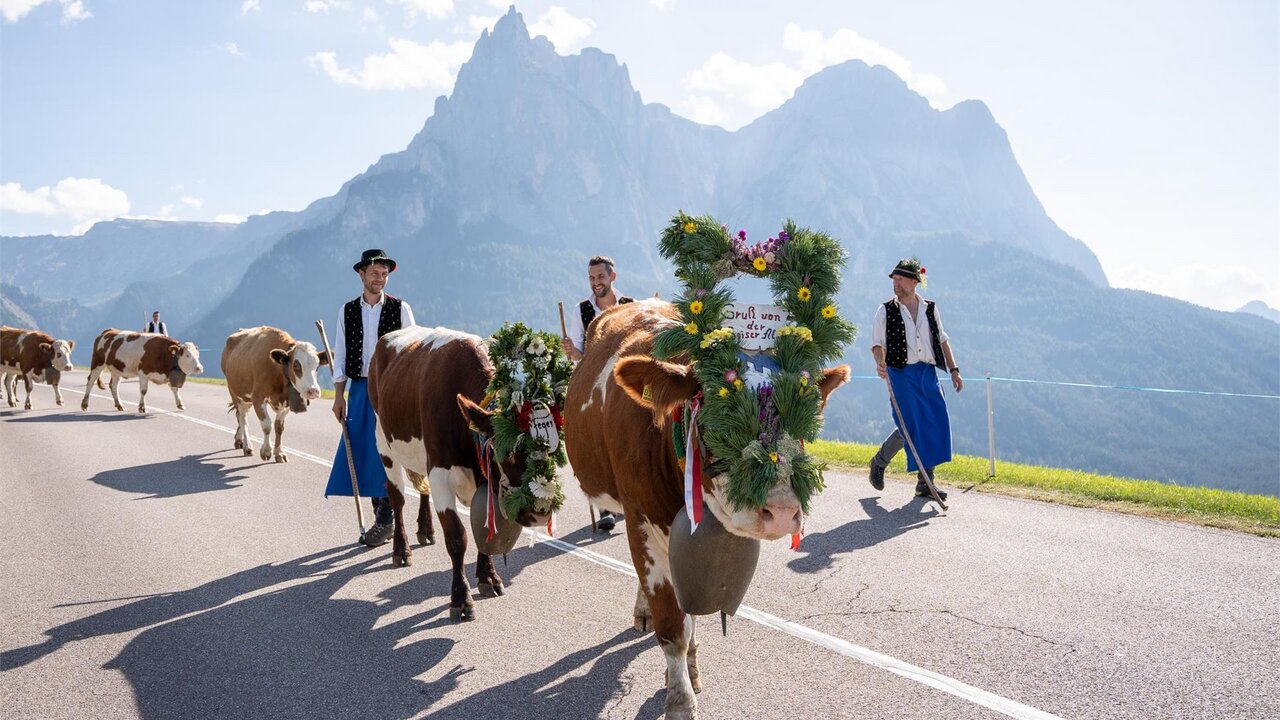 In October, it’s time for the cattle, horses, goats, and sheep that spent the summer on the Seiser Alm to return to the valley. On the Seiser Alm, the Transhumance is traditionally celebrated on Rosary Saturday, the Saturday before the Harvest Festival. Starting at 10:30 a.m., cows adorned with flower wreaths and bells fill the streets of Compatsch. The colorful herd of around 250 cattle, sheep, horses, and goats, along with decorated carts, then heads towards the valley and Kastelruth around midday.