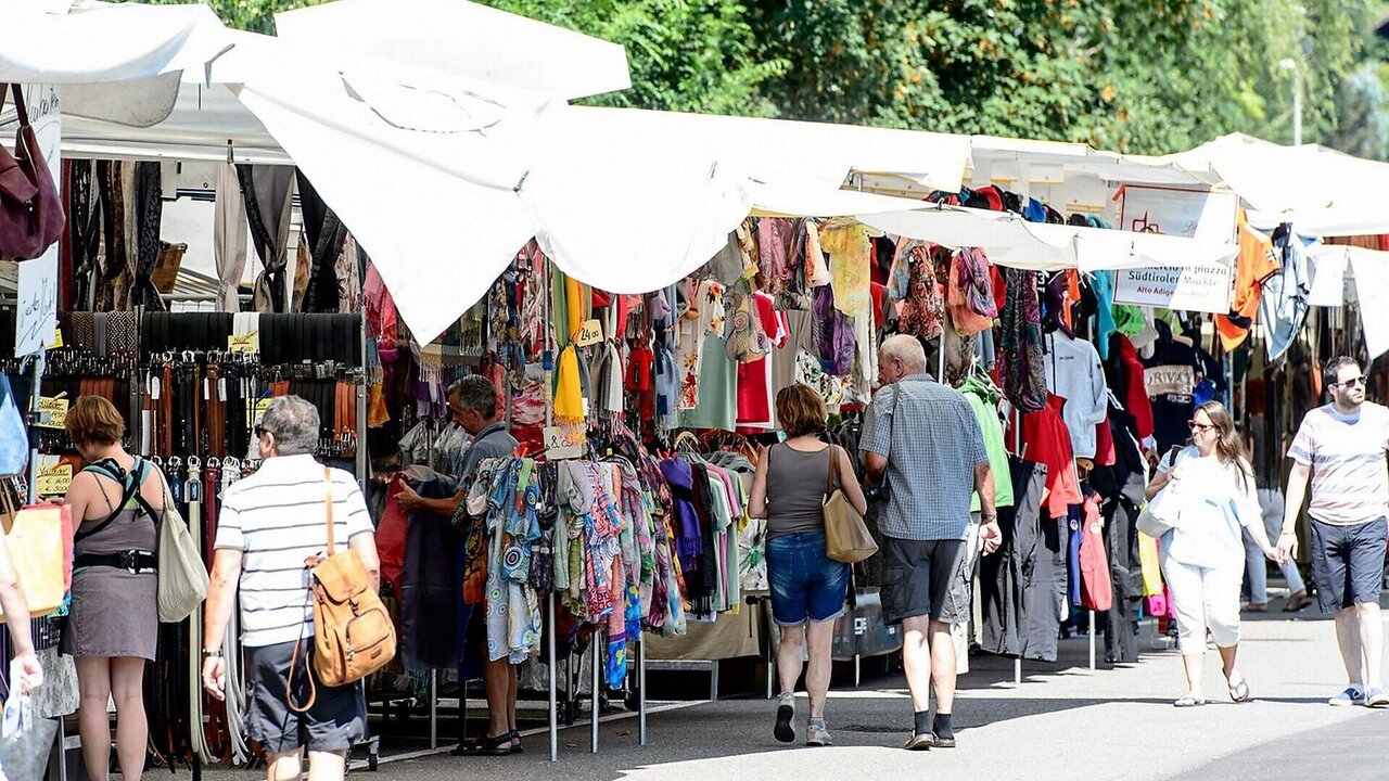 Weekly market of different textiles and accessories in Kaltern. On Wednesdays