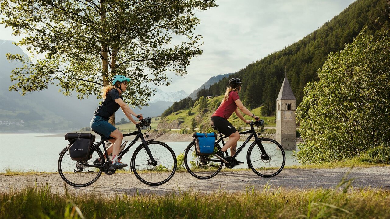 Con la e-bike, una pedalata culturale lungo le rive del lago di Resia Durante un tour culturale guidato in e-bike, scoprite la storia emozionante ed avvincente del villaggio sommerso e del campanile che emerge dal lago. La chiesetta romanica del XIV secolo è una testimone silenziosa della creazione del lago poco dopo la fine della Seconda Guerra Mondiale. I bunker sono un'altra testimonianza del periodo tra le due guerre. Insieme a una guida ciclistica, avrete l'opportunità di visitare il bunker della sorgente dell'Adige e di conoscere la storia dell'Alto