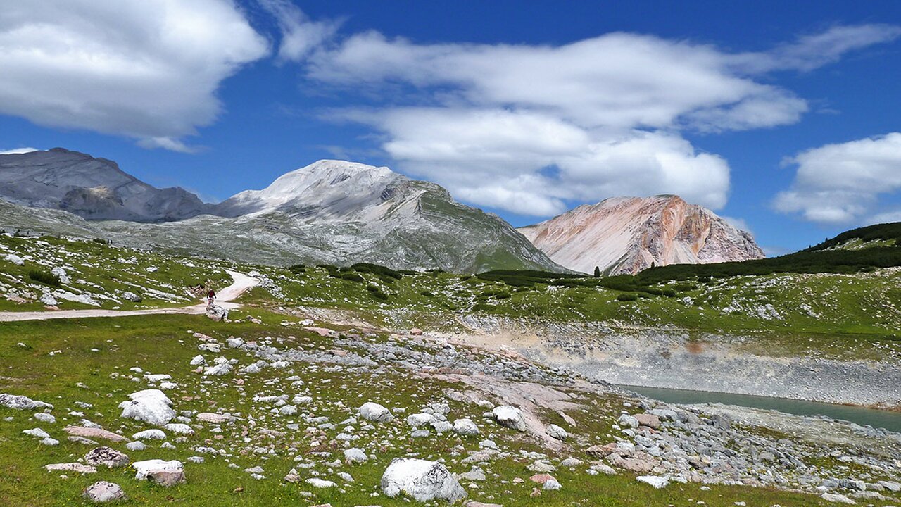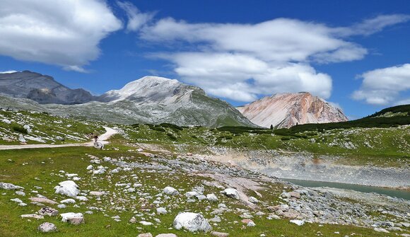 Ripida ascesa al Col de Locia (2.069 m). Camminando in quota si raggiungono la Malga di Fanes Grande e il Passo Limo (2.172 m), per scendere ai Rifugi Fanes e Lavarella (2.060m).