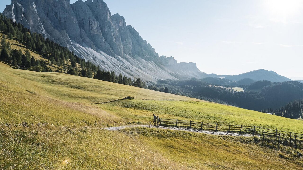 Il taxi ci porta al parcheggio Zannes (1695m) in Val di Funes. Da Zannes seguiamo il sentiero n. 6 in direzione di Ciancenon fino al ponte. Qui giriamo a destra sul sentiero Adolf Munkel n. 35 fino al Rif. Brogles (2045m). Dopo il pranzo continuiamo sul sentiero n. 35 fino al prossimo bivio. Qui prendiamo il sentiero n. 5 fino ad Ortisei (1263m)