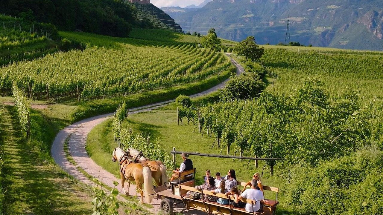 Passeggiata in carrozza attraverso la campagna di Appiano con sosta presso il cocchiere per una degustazione di vini.