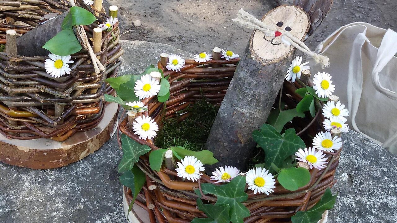Vaghiamo per il bosco e raccogliamo legno, rami pieghevoli, muschio, fiori e foglie... Poi scegliamo un angolo appartato per fare un decorativo nido di Pasqua che riempiremo di piccole delizie. Inoltre facciamo diversi giochi per scoprire la natura.