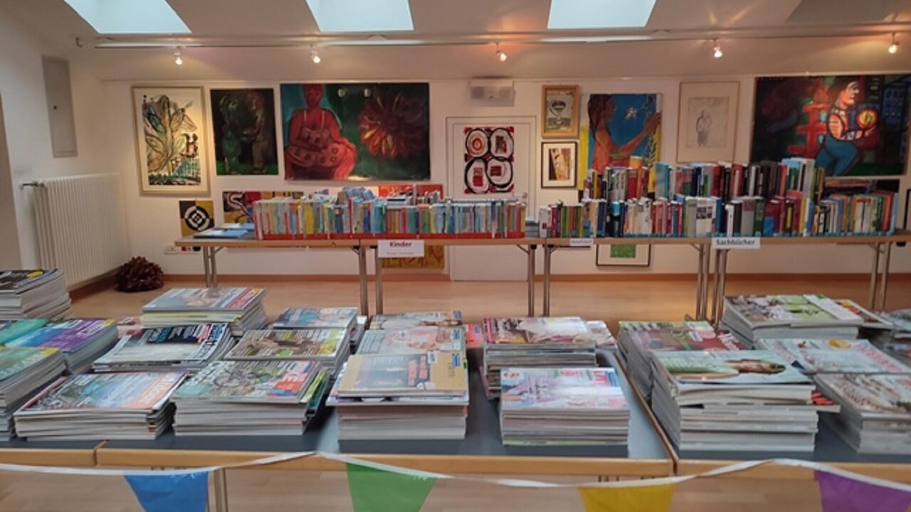 Mercatino dei libri nella sala della biblioteca di Naturno: libri, riviste e altro ancora aspettano un pubblico interessante. 1 kg di libri = € 1,-