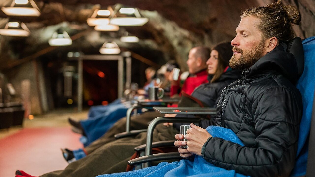 Salite a bordo del trenino della miniera e lasciatevi trasportare tranquillamente nella montagna. Una volta arrivati nell'area del Centro climatico, vi attende un'atmosfera di serenità: suoni dolci e musica rilassante accompagnano il vostro relax. Con coperte e una borsa dell'acqua calda, potete rilassarvi mentre una tisana vi riscalda dall'interno. Prendetevi il tempo per respirare e assaporare l'aria pura e fresca della galleria.