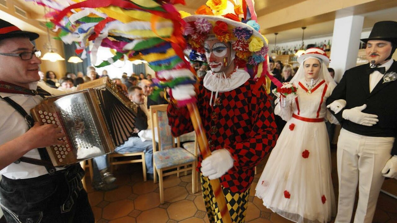 La domenica, il lunedì e il martedì grasso, i Maschger, guidati da un Bajaz, si esibiscono. Coppie allegre, mascherate ed esuberanti sfilano da una locanda all'altra, dove ballano e fanno scherzi secondo rituali prestabiliti.