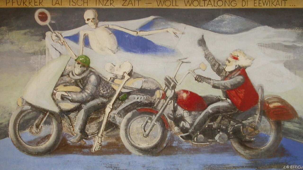 „Fermati per qualche momento, poi magari sai come andare avanti.“ Questa è una delle 18 frasi sulle schede illustrative del „Plauser Totentanz“ sul muro del cimitero di Plaus pitturate dall’artista Luis Stefan Stecher.