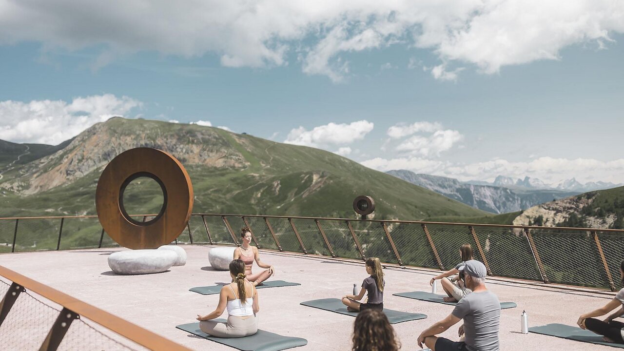 Sia dopo un'escursione nel comprensorio, sia dopo il lavoro o per dare inizio al tuo finesettimana: ogni venerdì pomeriggio dal inizio luglio, sul tetto della stazione intermedia della Cabinovia Naifjoch puoi partecipare gratuitamente alle sessioni di yoga.